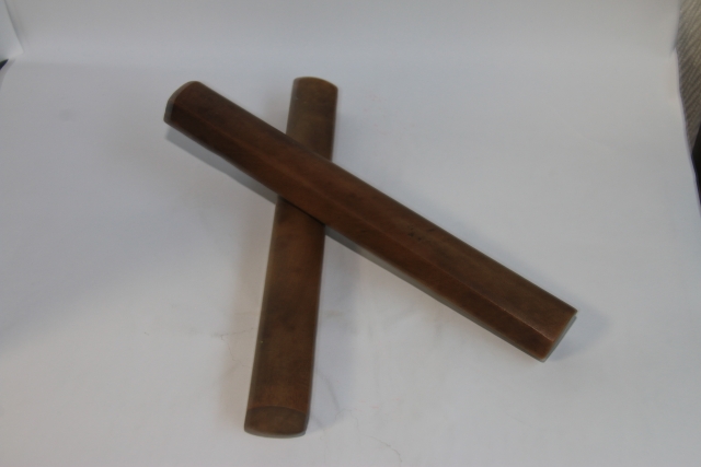 素材は紫檀、黒檀、花梨、樫など堅い木材を細長い四角の棒状に切り、2本1組にして紐で男結びにしてつなぐ。紐は長めで、使わないときは自分の首にかけてぶら下げておくことができる。